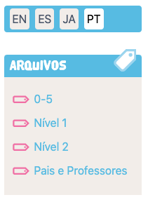 Por favor, repare que cada seção (0-5, Nível 1, Nível 2, e Pais e Professores) tem seu próprio índice (arquivo), que engloba todos os artigos postados nessa seção do site, com a finalidade de facilitar a busca dos materiais apropriados para as diferentes idades. Para se divertir com suas crianças, busque áudio, vídeos infantis ou “páginas para colorir)!